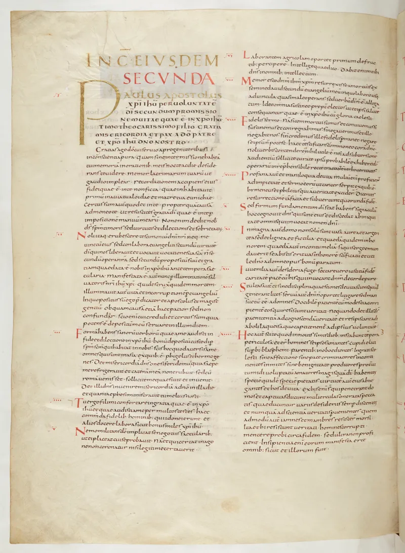 Folio 826 of the First Bible of Charles the Bald, an extant Carolingian Vulgate manuscript from the Tours scriptorium (c. 845). Approximately corresponds to Revelation 15 in Vulgate book order. The folio shows the actual ninth-century Latin text and decoration as it would have been read in the Carolingian court.