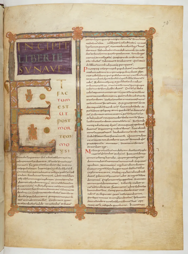 Folio 155 of the First Bible of Charles the Bald, an extant Carolingian Vulgate manuscript from the Tours scriptorium (c. 845). Approximately corresponds to Ruth 4 in Vulgate book order. The folio shows the actual ninth-century Latin text and decoration as it would have been read in the Carolingian court.