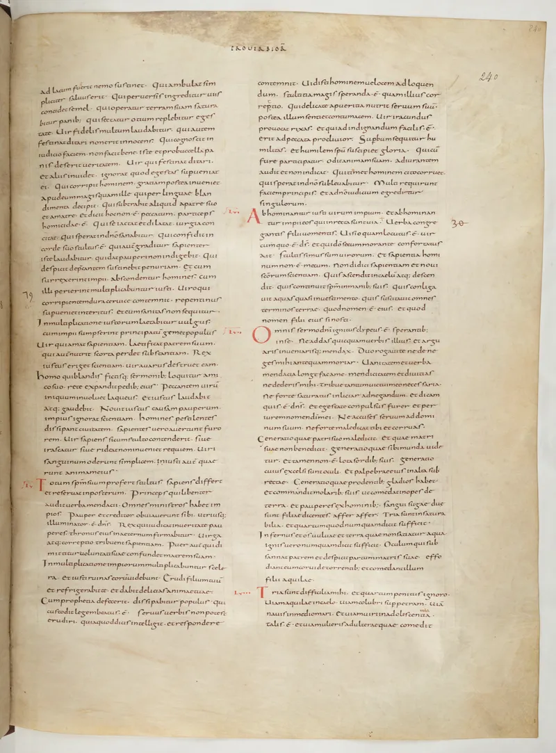 Folio 487 of the First Bible of Charles the Bald, an extant Carolingian Vulgate manuscript from the Tours scriptorium (c. 845). Approximately corresponds to Sirach 43 in Vulgate book order. The folio shows the actual ninth-century Latin text and decoration as it would have been read in the Carolingian court.