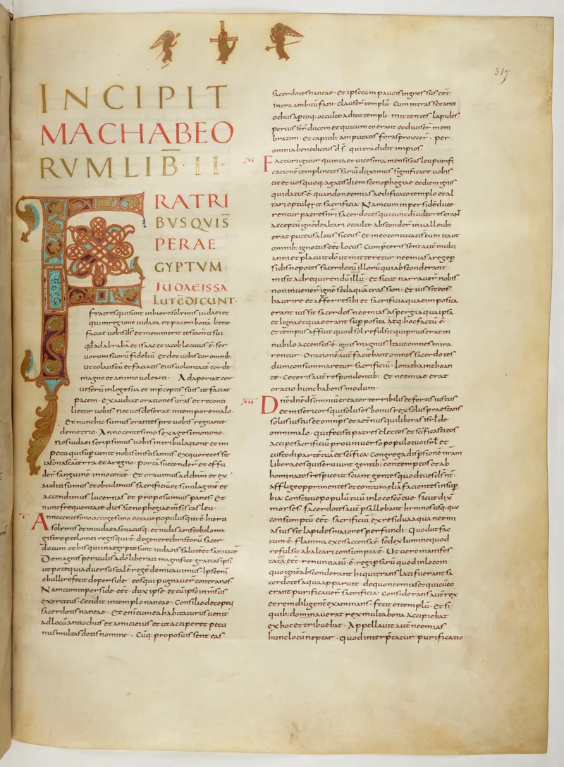 Folio 641 of the First Bible of Charles the Bald, an extant Carolingian Vulgate manuscript from the Tours scriptorium (c. 845). Approximately corresponds to Zechariah 3 in Vulgate book order. The folio shows the actual ninth-century Latin text and decoration as it would have been read in the Carolingian court.