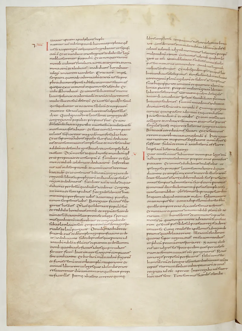 Folio 642 of the First Bible of Charles the Bald, an extant Carolingian Vulgate manuscript from the Tours scriptorium (c. 845). Approximately corresponds to Zechariah 5 in Vulgate book order. The folio shows the actual ninth-century Latin text and decoration as it would have been read in the Carolingian court.